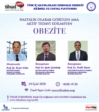 Türk İç Hastalıkları Uzmanlık Derneği Bilimsel ve Sosyal Platformu olan TİHUDUM (www.tihudum.org)’da 24 Eylül 2020 Perşembe günü Saat 18.00’de “Hastalık Olarak Görülen Ama Aktif Tedavi Edilmeyen Obezite” Canlı Konseyi gerçekleştirilecektir.