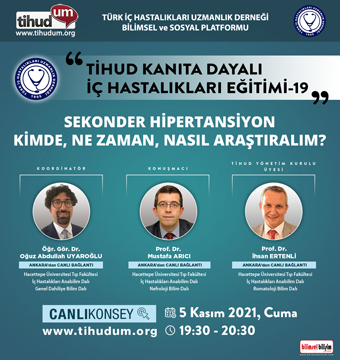 Türk İç Hastalıkları Uzmanlık Derneği Bilimsel ve Sosyal Platformu olan TİHUDUM (www.tihudum.org)’da 5 Kasım 2021 Cuma günü Saat 19.30’da “Tihud Kanıta Dayalı İç Hastalıkları Eğitimi-19: Sekonder Hipertansiyon - Kimde, Ne Zaman, Nasıl Araştıralım?” Canlı Konseyi gerçekleştirilecektir.