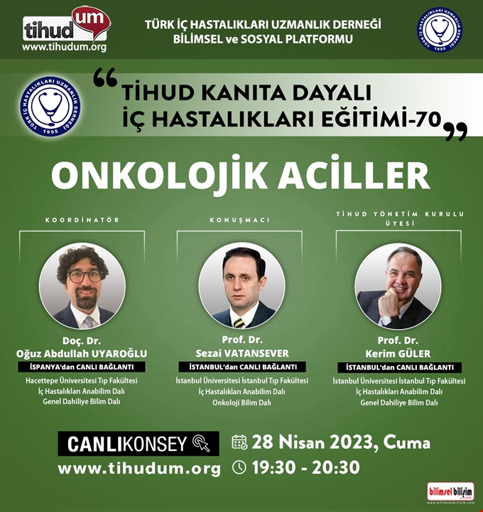 Türk İç Hastalıkları Uzmanlık Derneği Bilimsel ve Sosyal Platformu olan TİHUDUM (www.tihudum.org)’da 28 Nisan 2023 Cuma günü Saat 19.30’da “Tihud Kanıta Dayalı İç Hastalıkları Eğitimi-70: Onkolojik Aciller” Canlı Konseyi gerçekleştirilecektir.